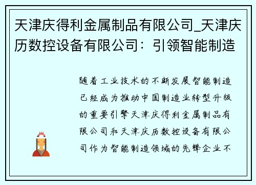 随着工业技术的不断发展,智能制造已经成为推动中国制造业转型升级的重要引擎。天津庆得利金属制品有限公司和天津庆历数控设备有限公司作为智能制造领域的先锋企业,不仅在技术创新方面取得了突破性进展,而且在市场竞争中取得了显著的优势。本文将从多个方面对这两家公司进行详细阐述。